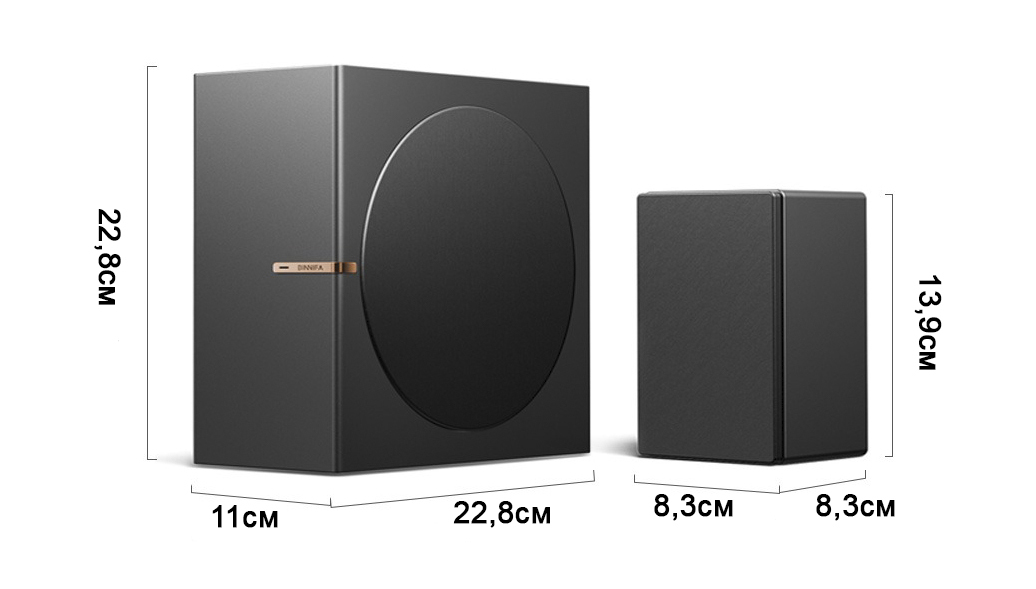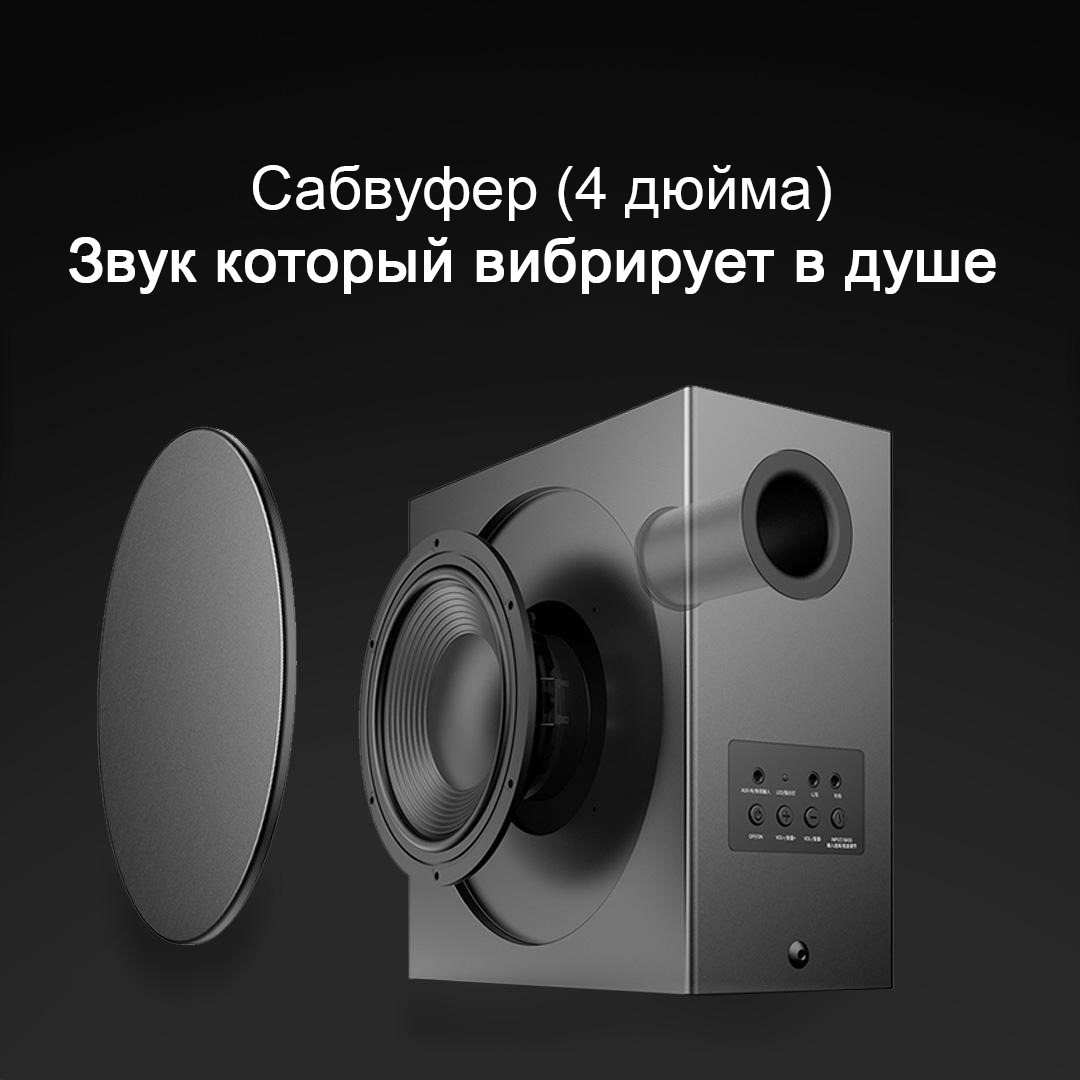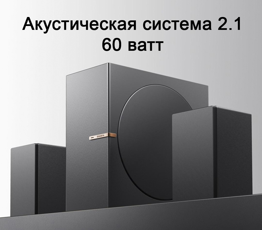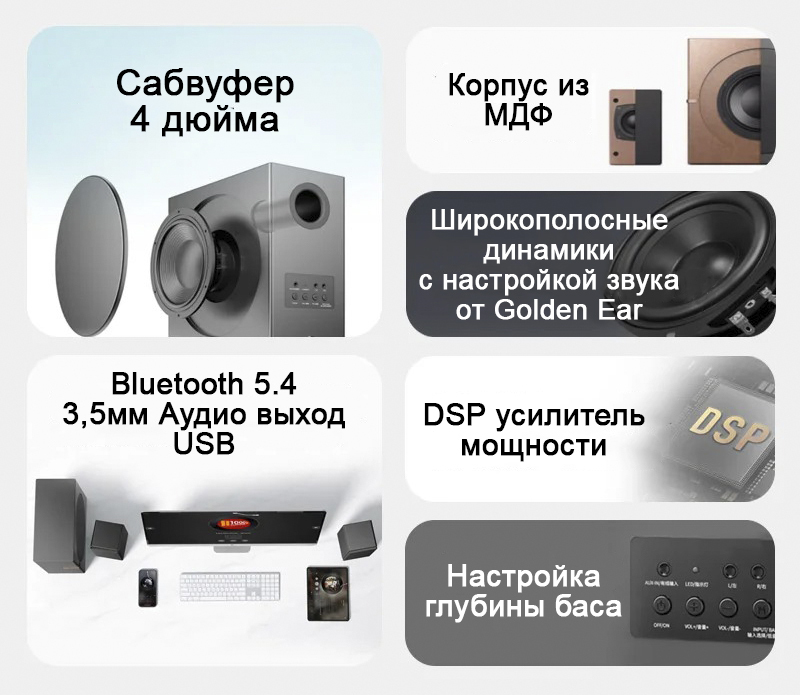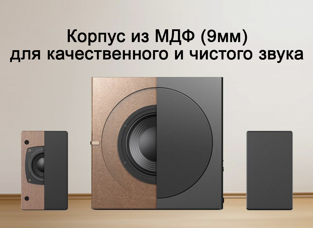 Акустическая система формата 2.1 с выходной суммарной мощностью 60 Вт в корпусе из МДФ. Широкоформатные динамики (2,5 дюйма) и Сабвуфер (4 дюйма) с проработанным басом настроенные командой Golden Ear. Поддерживают подключение по Bluetooth 5.4 и 3,5мм Аудио выход, а так же проигрывание музыки через USB.