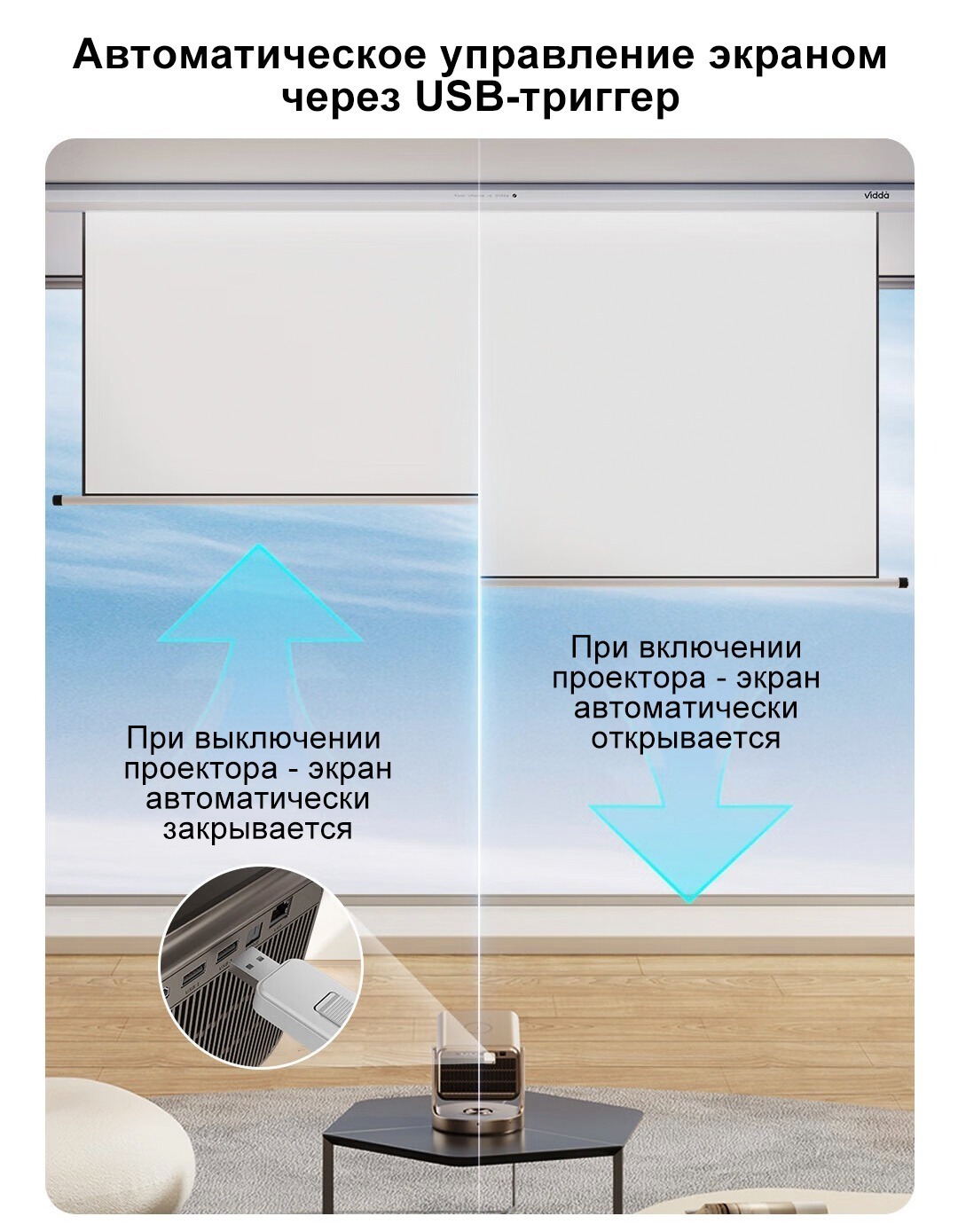 Экран оснащен Моторизированной системой привода, открытие/закрытие экрана происходит с помощью беспроводного пульта или автоматически через USB-триггер. Он может быть установлен на стену или потолок, благодаря своей складной конструкции.