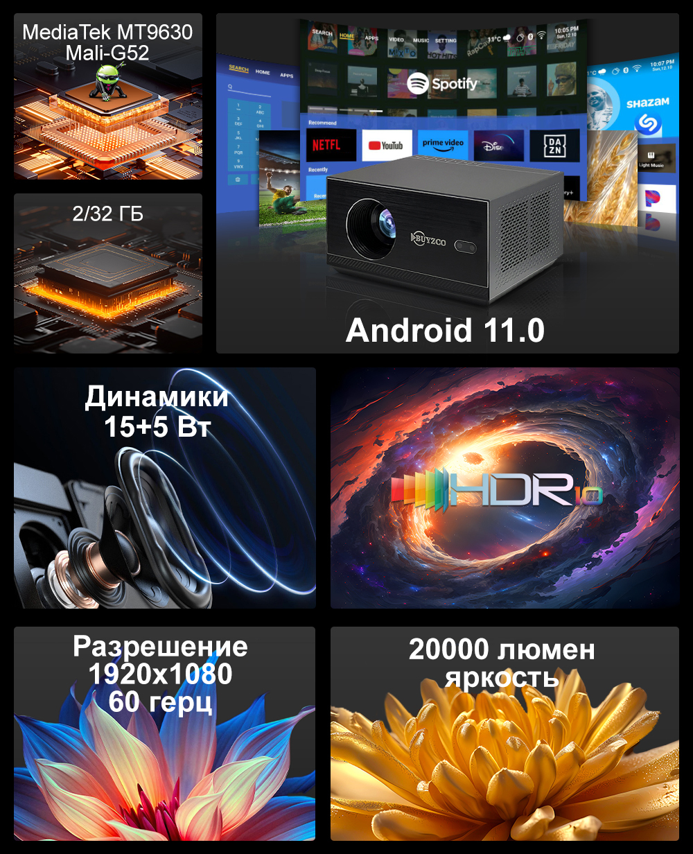 Проектор со встроенным Android 11.0 (2/32ГБ) на процессоре MediaTek MT9630 (Видеочип: Mali-G52) с поддержкой AV1 кодека! Закрытая система охлаждения защищает от попадания пыли на матрицу! Два динамика 15+5 Вт выдают хороший качественный звук. Подходит для игровых приставок PS/XBOX (Input Lag - 40мс). Встроенный Android позволяет устанавливать любые приложения - Фильмы/Сериалы/IP TV/Спортивные телеканалы/Игры (Sony PlayStation 1, Super Nintendo, SEGA Mega Drive 2, Nintendo 64, Dendy, Game Boy Advance, DOS и т.д.) - БЕСПЛАТНО!