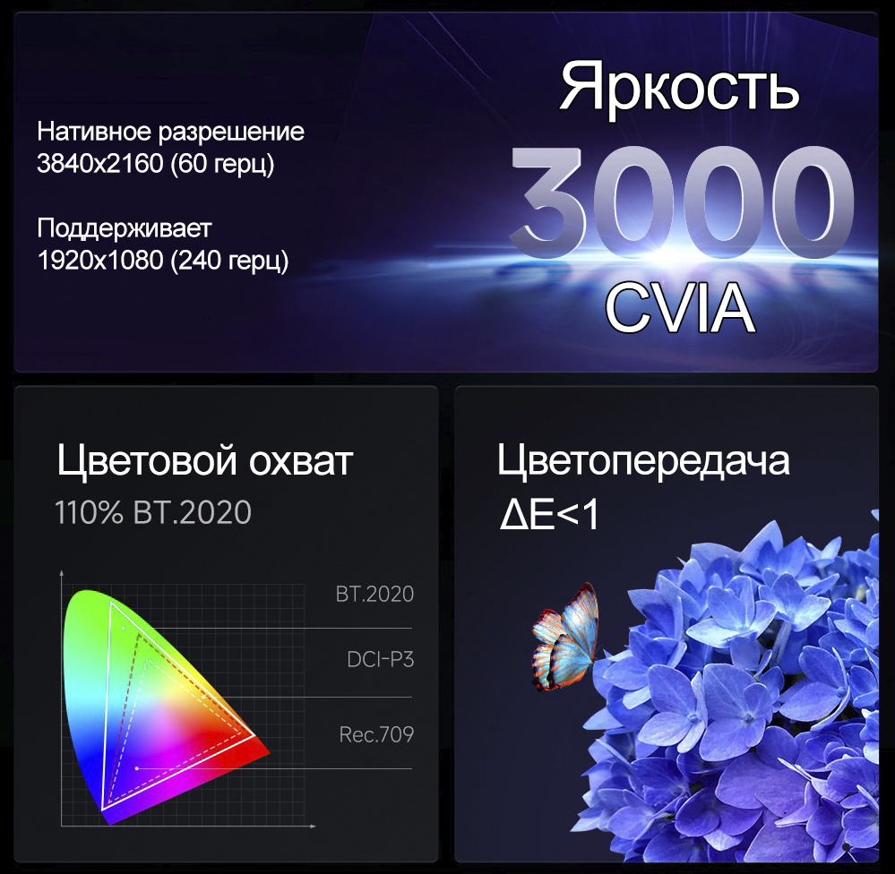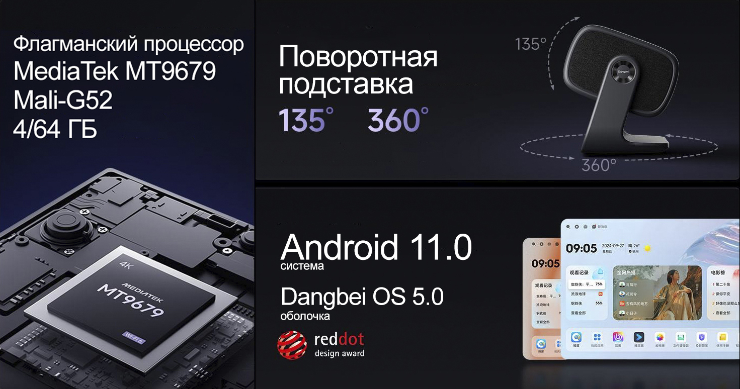 Проектор от известного бренда "Dangbei" - F7 PRO. Яркость проектора составляет 3000 CVIA с поддержкой HDR10+, а благодаря разрешению 3840х2160 и фирменному набору ИИ алгоритмов улучшения качества изображения от Danbei - изображение по четкости и цветопередачи будет идеальным! Технология "XSuper" (Super-Resolution) - способна улучшить любое видео в низком разрешение до 4К. Поддерживает Hi-MEMC (120 герц) технологию компенсации движения. Встроенный Android 11.0 (4/64ГБ) с мощным процессором MediaTek MT9679 (Видеочип: Mali-G52) который способен проигрывать 8К контент - позволяет устанавливать любые APK файлы для бесплатного просмотра онлайн кинотеатров, кабельного (IPTV), YouTube, просмотра торрентов и любых других задач. Отлично подойдет для игровых приставок так как данный проектор способен работать в 240 герц при 1080р и 60 герц при 4К. Поддержка Bluetooth 5.2 для подключения беспроводной акустики/наушников/геймпадов и т.д. Поддержка технологии 3D DLP-Link для воспроизведения 3D контента в сочетании с высокой яркостью 3000 CVIA и разрешению 3840х2160 - сделают кино по настоящему живым!