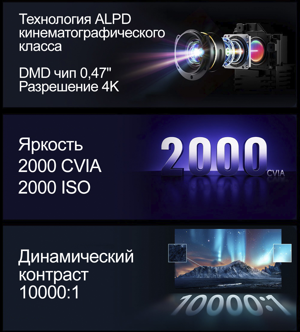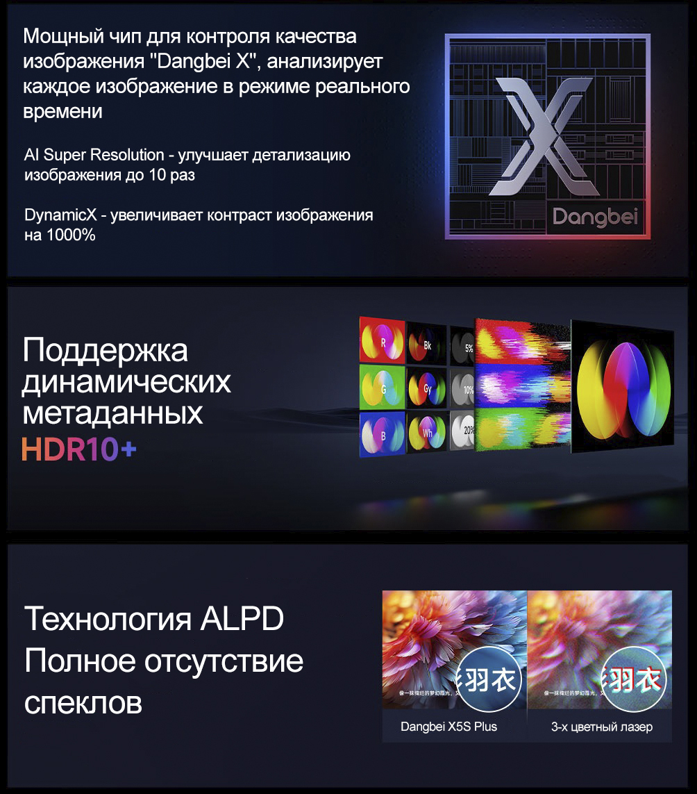 Проектор от известного бренда "Dangbei" - X5S Plus. Яркость проектора составляет 2000 CVIA с поддержкой HDR10+, а благодаря разрешению 3840х2160 и фирменному набору ИИ алгоритмов улучшения качества изображения от Danbei - изображение по четкости и цветопередачи будет идеальным! Технология AI Super-Resolution - способна улучшить любое видео в низком разрешение до 4К. Благодаря новому процессору "Dangbei X" и алгоритму DynamicX получилось увеличить динамический контраст до 10000:1! Поддерживает Hi-MEMC (120 герц) технологию компенсации движения. Встроенный Android 9.0 (3/64ГБ) с мощным процессором MediaTek MT9669 (Видеочип: Mali-G52) который способен проигрывать 8К контент - позволяет устанавливать любые APK файлы для бесплатного просмотра онлайн кинотеатров, кабельного (IPTV), YouTube, просмотра торрентов и любых других задач. Отлично подойдет для игровых приставок так как данный проектор способен работать в 240 герц при 1080р и 60 герц при 4К. Поддержка Bluetooth 5.2 для подключения беспроводной акустики/наушников/геймпадов и т.д. Поддержка технологии 3D DLP-Link для воспроизведения 3D контента в сочетании с высокой яркостью 2000 CVIA и разрешению 3840х2160 - сделают кино по настоящему живым!