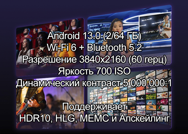 Проектор от мирового производителя "Epson", EF-50 привлекает внимание сочетанием цена/качество. Новинка отличается от конкурентов своим компактным корпусом и хорошей яркостью. В данной модели Epson использует новую технологию собственной разработки "Triple Core Engine". Яркость проектора составляет 700 ISO, а благодаря 0,62" чипу с разрешением 4K (3840x2160) изображение будет четким и контрастным. Встроенный Android 13.0 (2/64ГБ) с мощным процессором MediaTek поддерживает технологию MEMC, HDR10, HLG и Апскейлинг. Android позволяет устанавливать любые APK файлы для бесплатного просмотра онлайн кинотеатров, кабельного (IPTV), YouTube, просмотра торрентов и любых других задач. Поддержка Bluetooth 5.2 для подключения беспроводной акустики/наушников/геймпадов и т.д. Шум работы проектора в Стандартном режиме ниже 24дБ, а в ЭКО-режиме ниже 20 дБ - что делает его самым тихим проектором в своей категории.