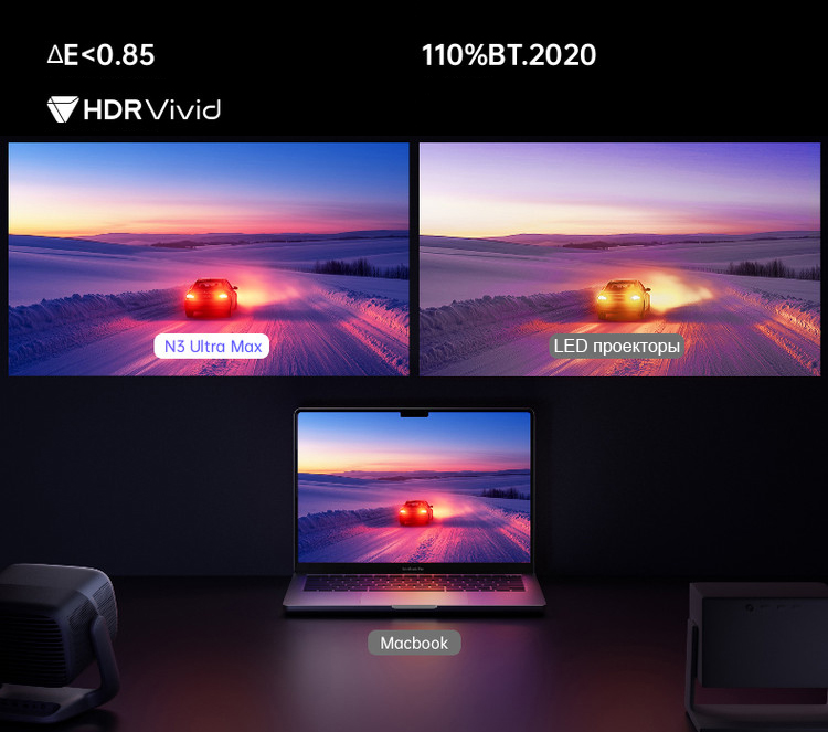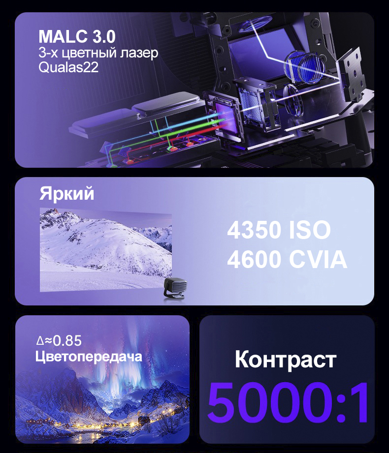 Проектор JMGO N3 Ultra Max построен на новейшей технологии "MALC 3.0" с новым 3-х цветным лазером "Qualas22", благодаря которому удалось добиться идеальной цветопередачи ΔE<0,85 с отличной яркостью 4600 CVIA, цветовой охват равен 110% BT.2020, а контраст достигает 1600:1! Новый лазер 2024 года "Qualas22" избавился от "спеклов" присущие предыдущей версии лазера который использовался в проекторах 2023 года!