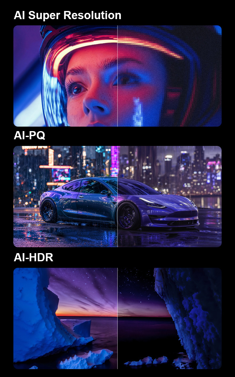 Встроенный Android 11.0 (4/128ГБ) с флагманским процессором MediaTek MT9679 способен проигрывать 8К контент, повышать качество фильмов с помощью технологии "AI Super Resolution"(Апскейлинг). Система Android позволяет устанавливать любые APK файлы для бесплатного просмотра онлайн кинотеатров, кабельного (IPTV), YouTube, просмотра торрентов и любых других задач. Отлично подойдет для игровых приставок XBOX/PlayStation (Input Lag = 12мс). Поддержка Bluetooth 5.2 для подключения беспроводной акустики/наушников/геймпадов и т.д.