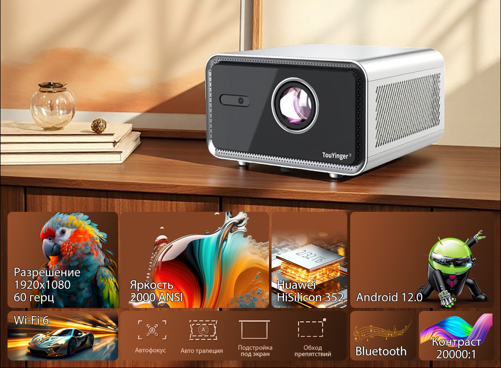 Проектор от бренда TouYinger на 1LCD технологии. Хороший вариант для создания домашнего кинотеатра благодаря матрице 1080p и хорошей яркости для 1LCD проекторов в 2000 ANSI, с возможностью подключения внешней акустики/наушников по Bluetooth. Встроенный Android 12.0 (2/32ГБ) с процессором от Huawei HiSilicon 352 позволяет устанавливать любые приложения - Фильмы/Сериалы/IPTV/Спортивные телеканалы/Игры (Sony PlayStation 1, Super Nintendo, SEGA Mega Drive 2, Nintendo 64, Dendy, Game Boy Advance, DOS и т.д.) - БЕСПЛАТНО!