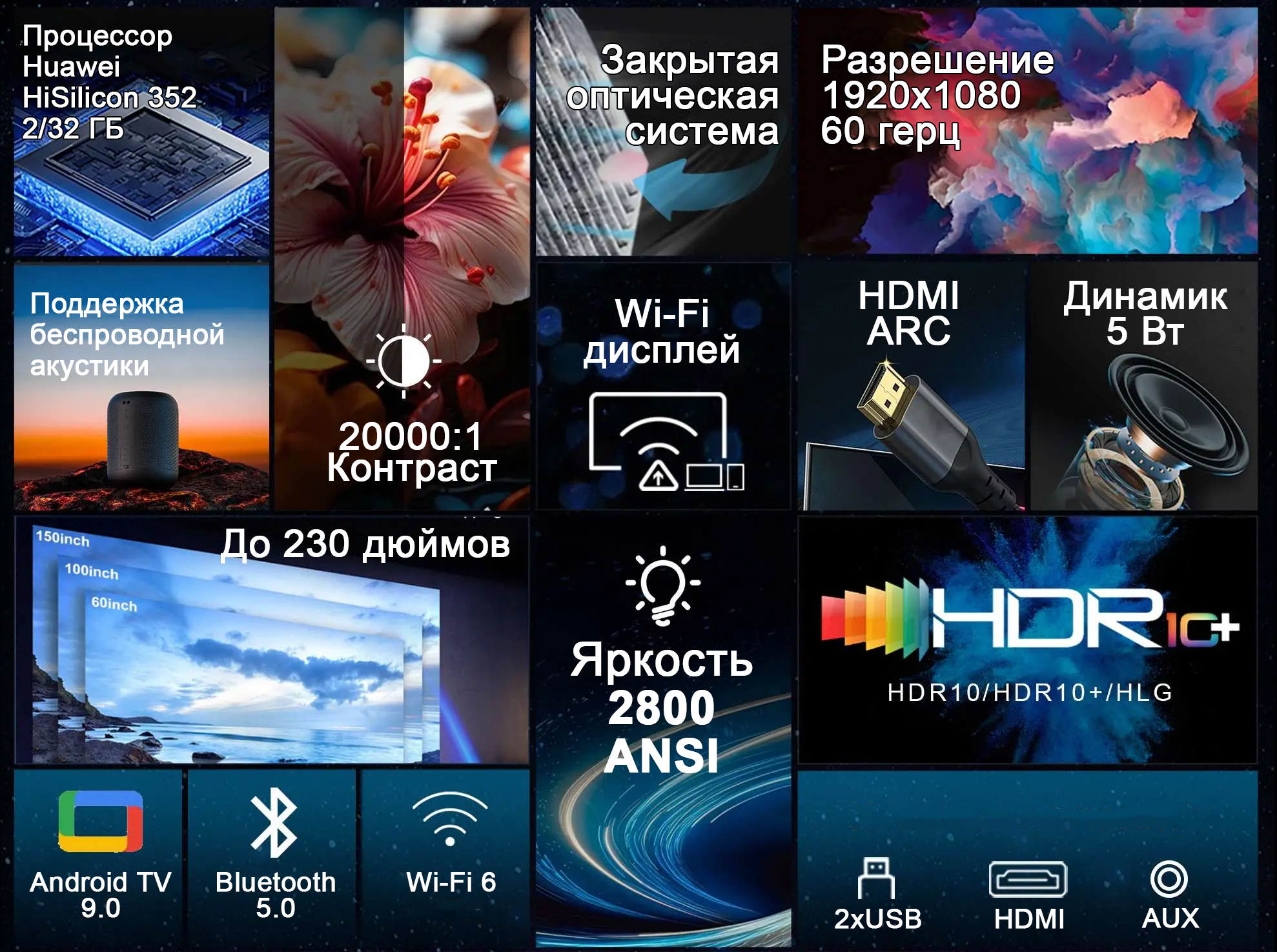 Проектор в который внедрили все современные технологии, такие как автоматический обход препятствий, автоматическая подстройка экрана под размер экрана, автоматическая коррекция трапеции, автоматическая фокусировка, ночной режим работы и многое другое. Яркость проектора составляет 2800 ANSI люмен, используется процессор HiSilicon 352 от Huawei с поддержкой Wi-Fi 6 и поддержкой 4К контента, отлично подходит для фильмов, с возможностью подключения внешней акустики по Bluetooth, и поддержкой HDMI-CEC. Встроенный сертифицированный Android TV 9.0 с 2/32ГБ памятью позволяет устанавливать любые приложения - Фильмы/Сериалы/IP TV/Спортивные телеканалы/Игры (Sony PlayStation 1, Super Nintendo, SEGA, Nintendo 64, Dendy, Game Boy Advance и т.д.) - БЕСПЛАТНО!