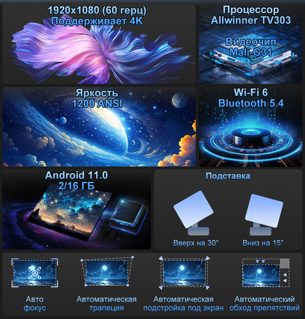Проектор с возможностью подключения внешней акустики/наушников по Bluetooth 5.0. Встроенный Android 11.0 позволяет устанавливать любые приложения - Фильмы/Сериалы/IPTV/Спортивные телеканалы/Игры (Sony PlayStation 1, Super Nintendo, SEGA Mega Drive 2, Nintendo 64, Dendy, Game Boy Advance, DOS и т.д.) - БЕСПЛАТНО!
