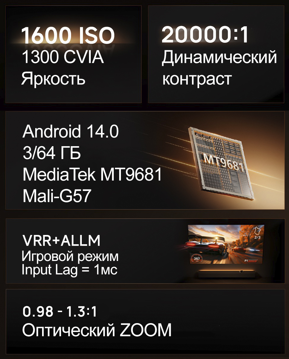 Проектор от мирового производителя проекторов "XGIMI", Z9X привлекает внимание своими размерами - это первый мини-проектор с нативным разрешением 4К и технологией 3-х цветного лазера! Его легко можно взять с собой, размер корпуса составляет 244х78х254мм и всего 1,5кг - благодаря чему он поместится в любую сумку. Встроенный Android 14.0 (3/64ГБ) с флагманским процессором MediaTek MT9681 способен проигрывать любой контент и позволяет устанавливать любые APK файлы для бесплатного просмотра онлайн кинотеатров, кабельного (IPTV), YouTube, просмотра торрентов и любых других задач. Отлично подойдет для игровых приставок XBOX/PlayStation (Input Lag = 1мс). Поддержка Bluetooth 5.2 для подключения беспроводной акустики/наушников/геймпадов и т.д. Возможность воспроизведения 3D контента по технологии 3D DLP-Link. За звук отвечает бренд Harman/Kardon с технологией Dоlby Audio и DTS:X.