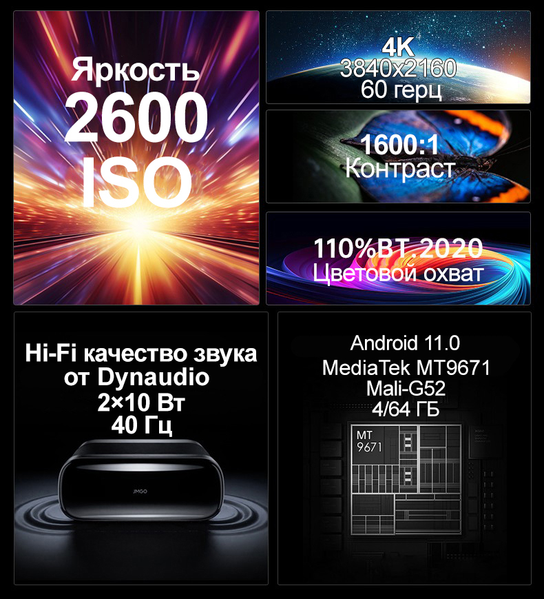 Ультракороткофокусный проектор JMGO O3 Pro построен на технологии "MALC 2.0" - 3-х цветном лазере, благодаря которому удалось добиться идеальной цветопередачи с отличной яркостью (2600 ISO), цветовой охват равен 110% BT.2020 (ΔE<1), а контраст достигает 1600:1! В первую очередь УКФ проектор — это простота и удобство, достаточно поставить его около стены, и вы можете наслаждаться вашим любимым контентом - кино, футбол, игры, YouTube и т.д.