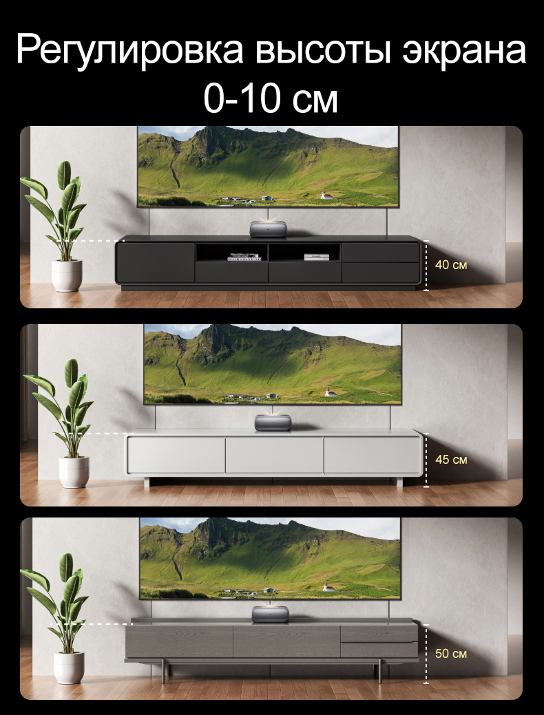 В компактный и легкий корпус компания вместила множество сенсоров и датчиков, создав невероятно технологичное устройство, с помощью которого вы сможете за мгновения получить свой большой собственный кинотеатр у себя прямо на стене просто поставив его у стены. Размещение УКФ проектора у экрана, дает дополнительные преимущества в сравнение с обычными проекторами — это более привычный звук со стороны изображения и свет от проектора не попадает к вам в глаза, когда вы перемещаетесь по комнате. Современные алгоритмы обработки изображения MEMC и HDR10+HLG. Input Lag составляет 12мс что означает что данный проектор подходит для игровых приставок XBOX/PlayStation.